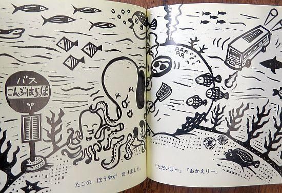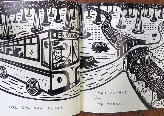 <内容紹介>お客さんをのせてバスが走ります。「つぎは、もりのいりぐち〜」。「プー」とブザーが鳴って、「つぎ、とまります」のアナウンスが流れます。停留所で降りたのは、なんとたぬきの兄弟。バスは、森の中、海の中、そして地面の中まで走っていき、次々といろいろな動物を降ろしていきます。「プー」「つぎ、とまります」の言葉とともにバスに乗った気分で楽しめる、ユーモラスな版画の絵本です。